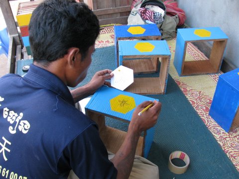 Izdelane panje je poslikal naš čebelar Thi z logotipom ČZ Kambodže. Namenili smo jih za simbolično darilo novonastalim čebelarskim klubom v Kambodži ter državni univerzi za kmetijstvo.
