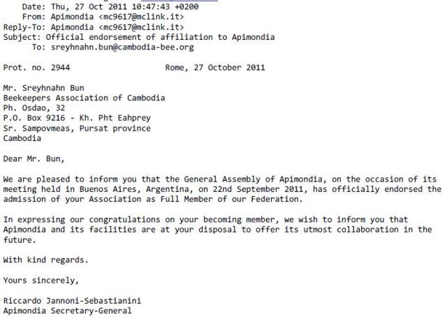22.9.2011 je Kamboška zveza postala polnopravni član mednarodne federacije čebelarskih zvez (Apimondie). S tem smo zagotovili tudi institucionalni razvoj čebelarstva v Kambodži.
