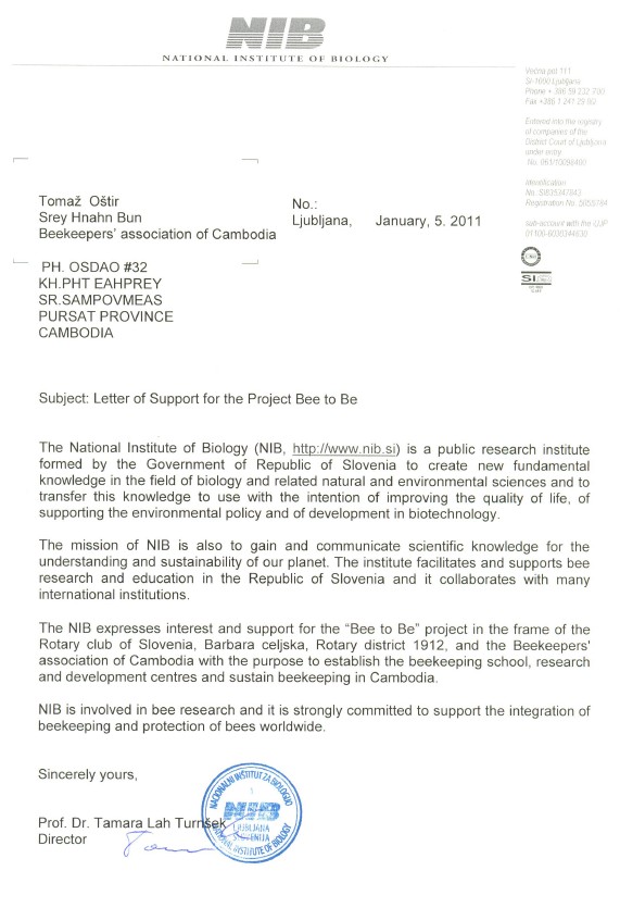 Projekt Slovensko čebelarsko šolo v Kambodži podpirajo slovenski Rotary klubi, Čebelarska zveza Slovenije in predsednik republike Slovenije dr. Danilo Türk.